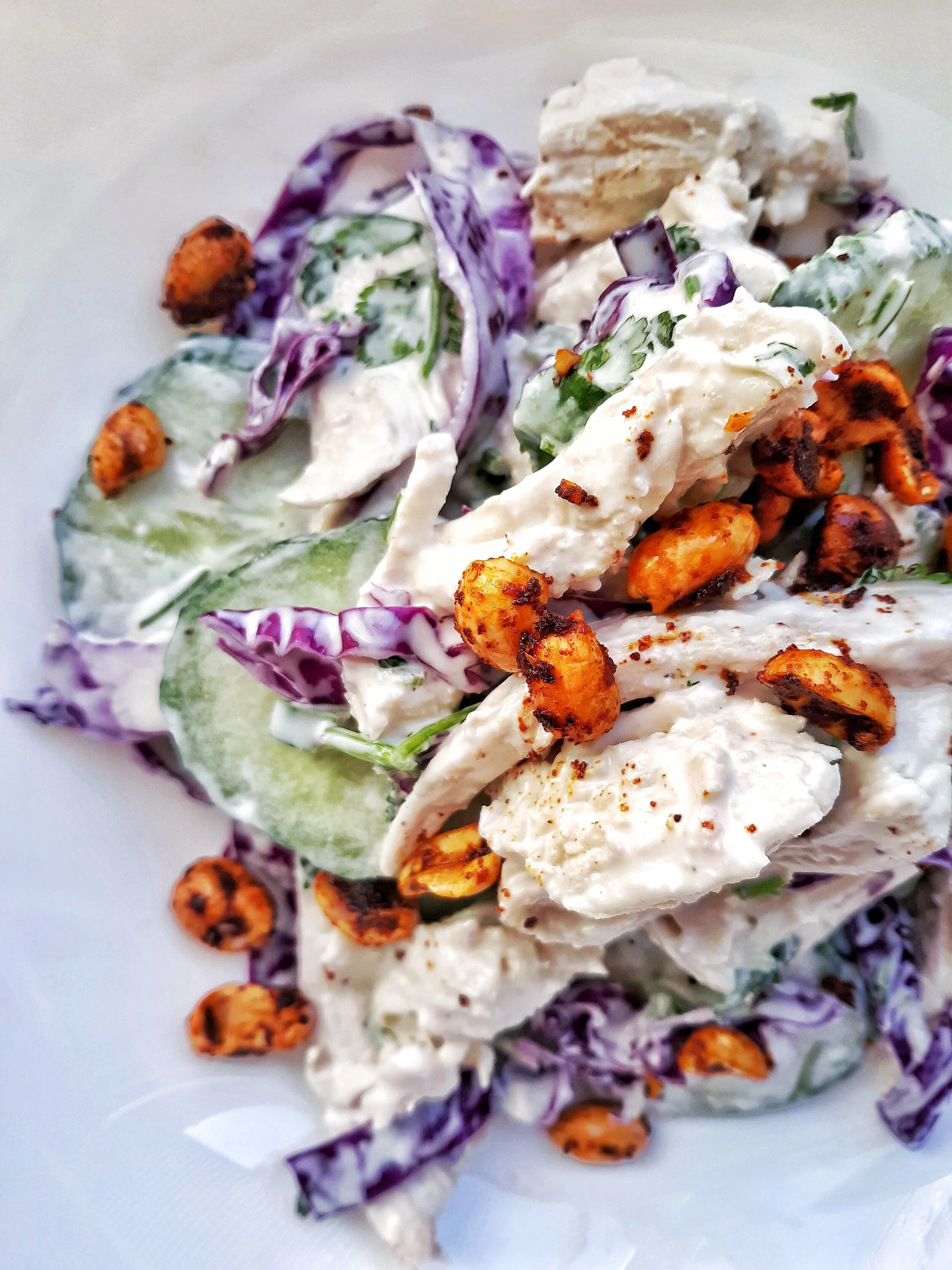 SALAD – In a large, wide, shallow mixing bowl combine mayo, Mexican crema, remaining 2 tbs olive oil, lime juice, tequila, cilantro, jalapeno, garlic and honey; whisk till blended—season with salt and pepper. Add chicken, cabbage, cucumbers and scallions (stems and leaves); toss to combine. Refrigerate for 20 minutes or up to 2 hours before serving. Garnish with chili-lime peanuts and enjoy. Serve with warm tortillas or pita bread.